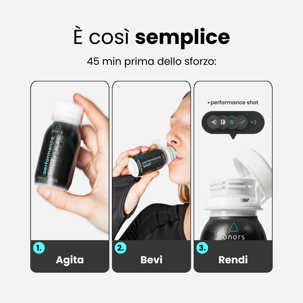 Bevi il Performance Shot prima del riscaldamento del tuo allenamento o della gara (circa 45 minuti prima della competizione).